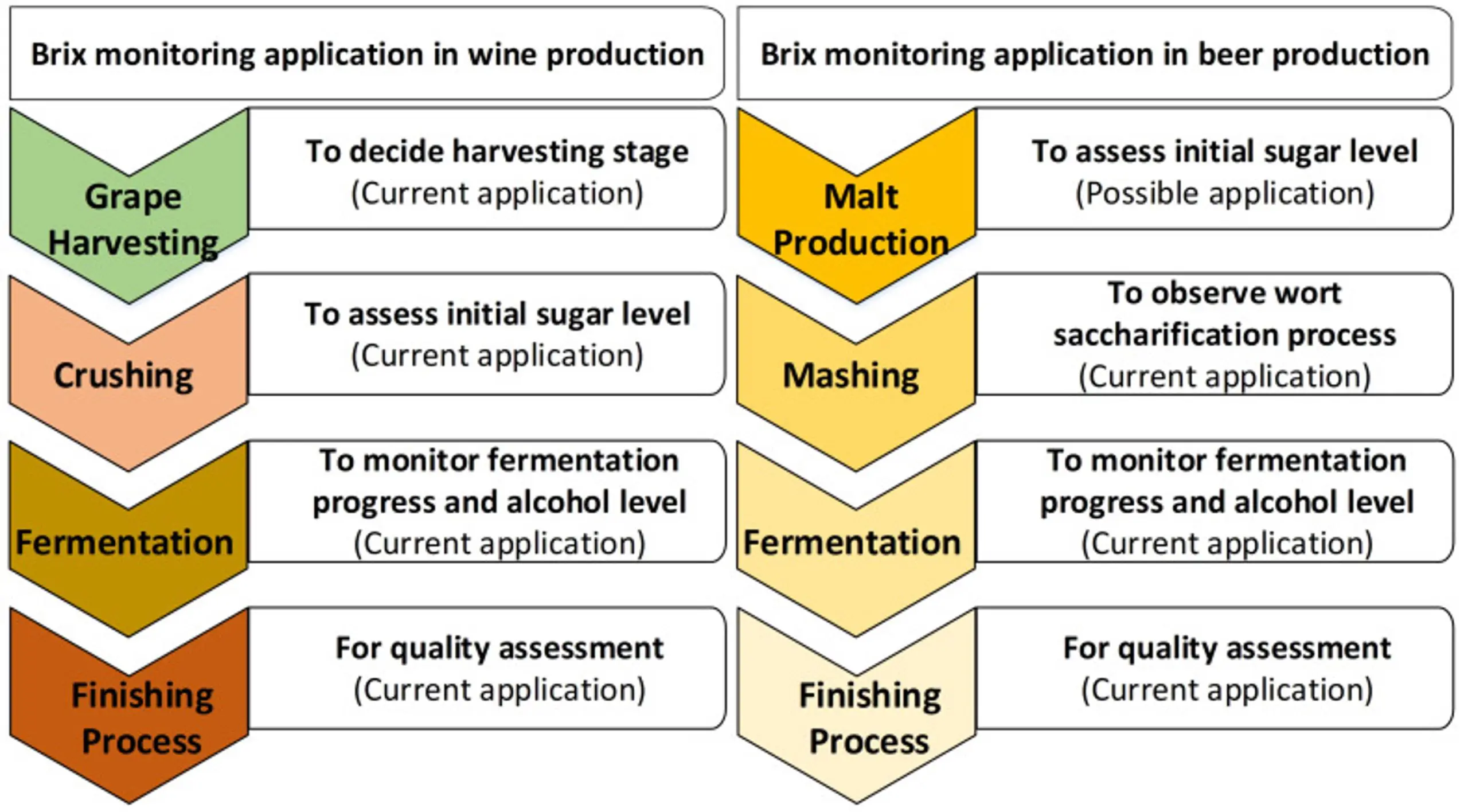 Figure 1: “Brix monitoring at different stages of wine and beer production,” Jaywant et al. 2022. (Image credits: doi: 10.3390/s22062290)