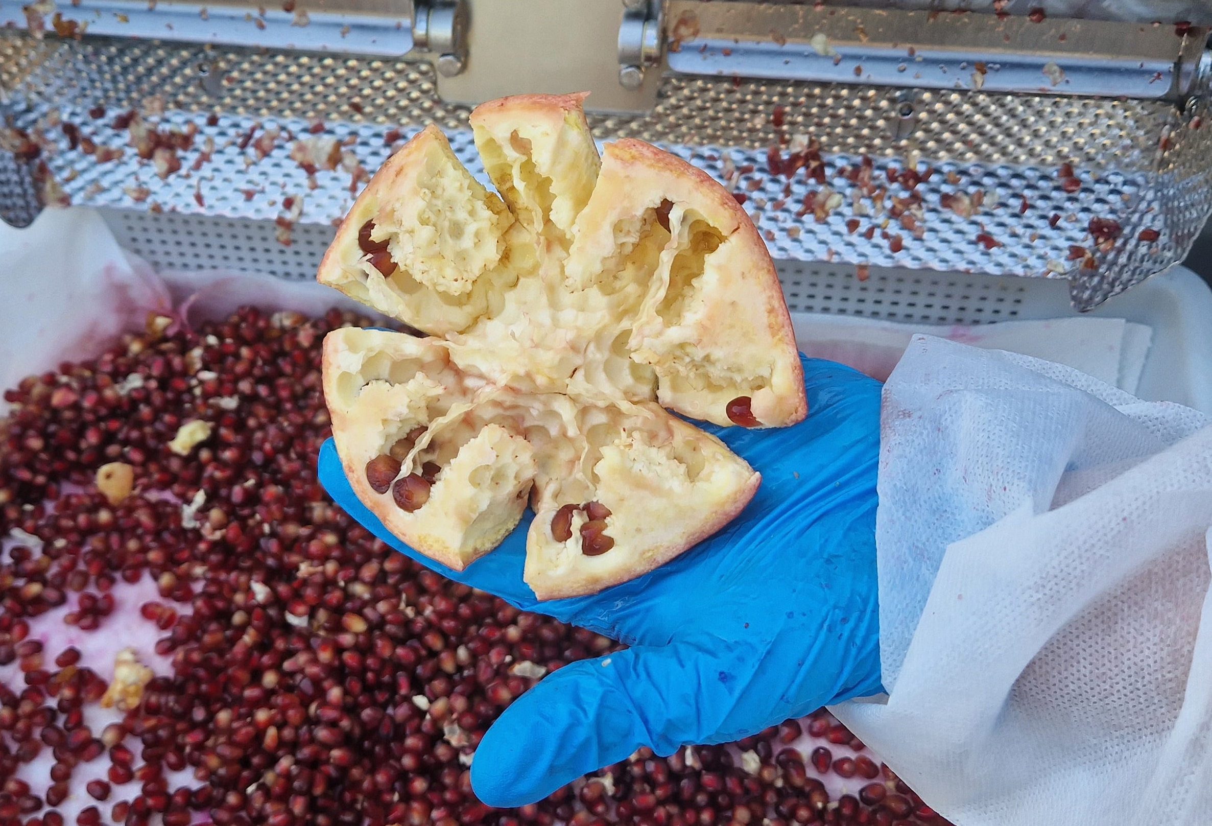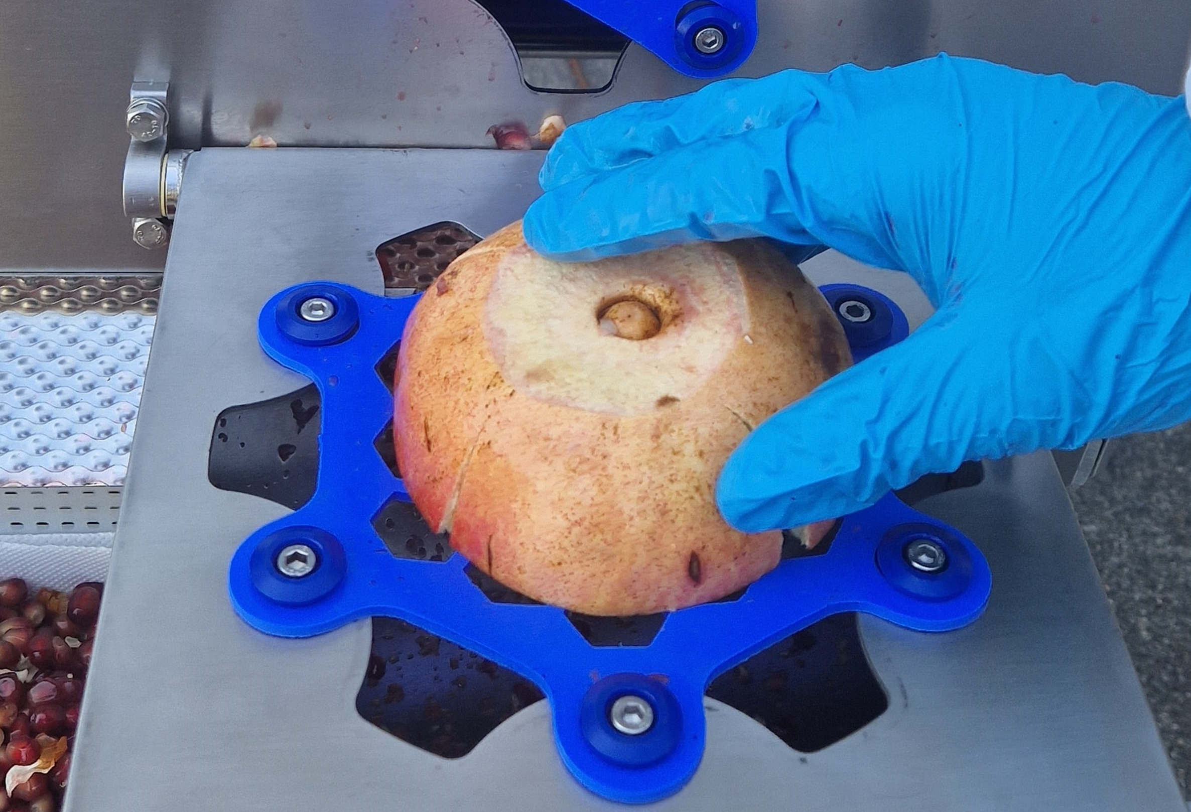 The SM2 shelling system, developed by PND, optimises the separation of arils from the peel through controlled mechanical action. Typically, the fruit is manually cut in half and placed into two processing heads. Inside, a lever mechanism intermittently taps the fruit, allowing the arils to detach cleanly without being crushed or torn.